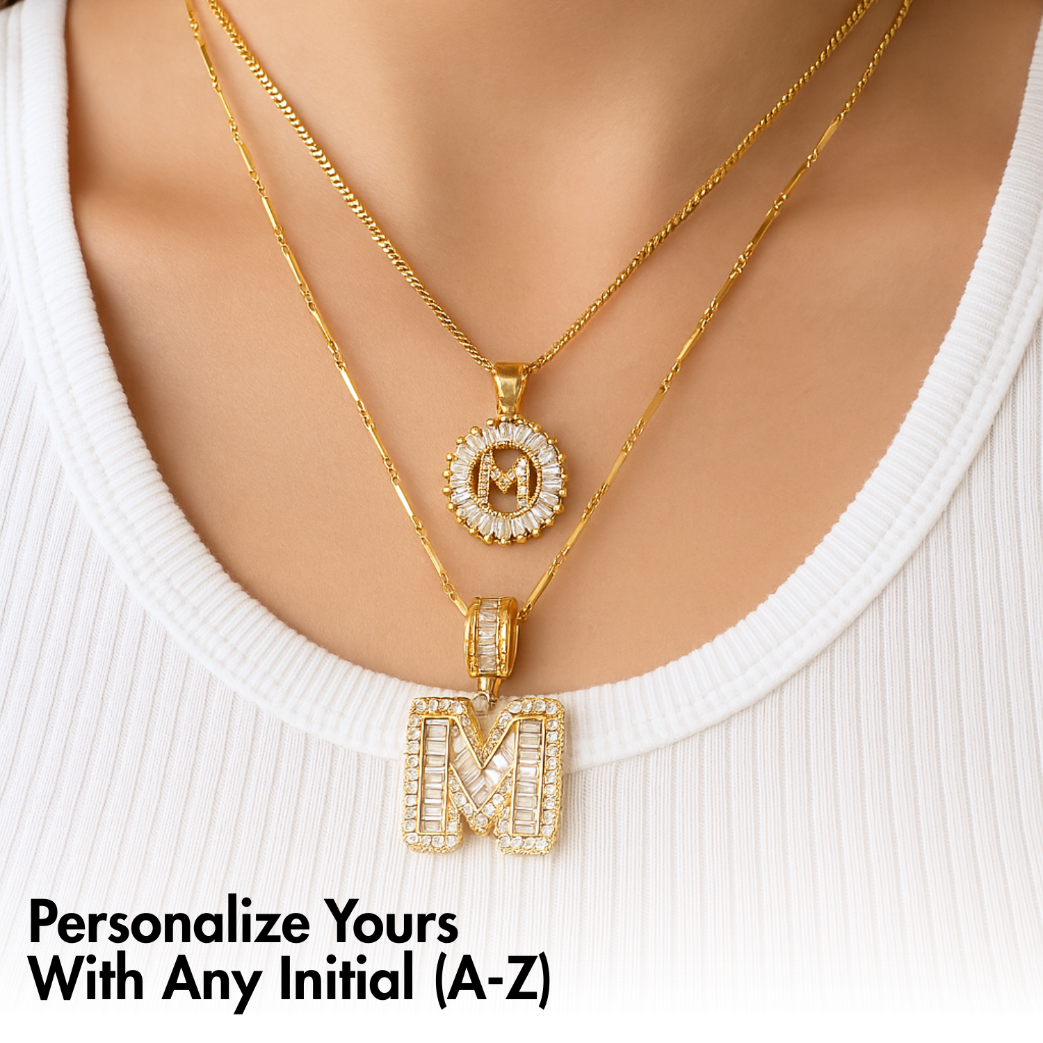 • Longer Necklace: Features a slightly thicker and more structured chain, with a larger diamond initial that creates a bold yet elegant contrast to the shorter piece. The mix of textures and sizes makes this set versatile and eye-catching.