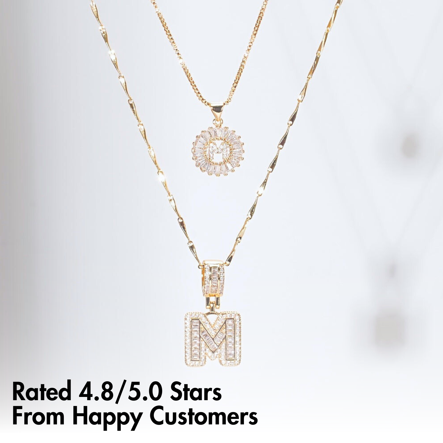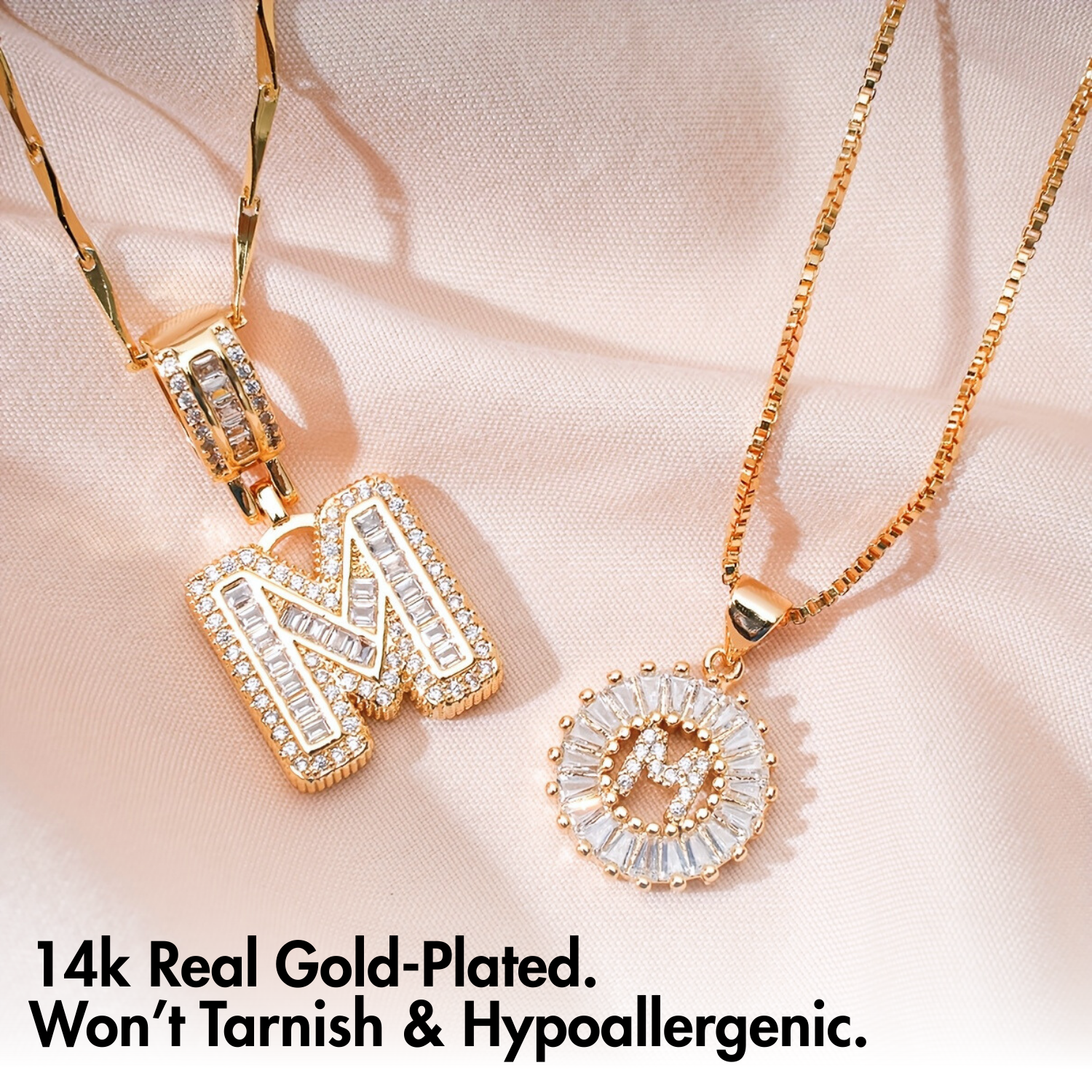• Shorter Necklace: A dainty gold box chain with a baguette diamond circle pendant. At the center sits a delicate paved diamond initial, adding a subtle yet luxurious touch.